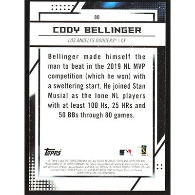 This is a 2020 Topps Fire Cody Bellinger baseball card. The card is #80 and pictures show condition.