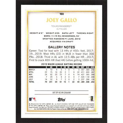 This is a 2020 Topps Gallery Joey Gallo SP - Apprentices baseball card. The card is #160 and pictures show condition.