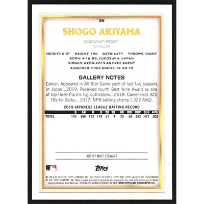 This is a 2020 Topps Gallery Shogo Akiyama baseball card. The card is #35 and pictures show condition.