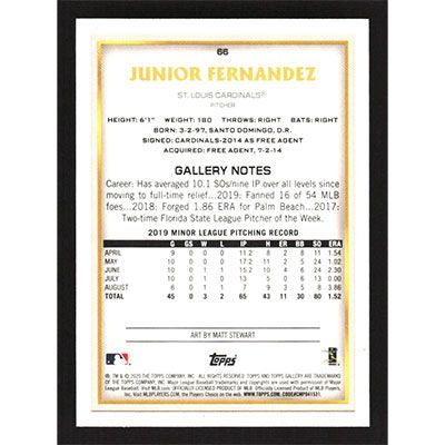 This is a 2020 Topps Gallery Junior Fernandez baseball card. The card is #66 and pictures show condition. Team(s): St. Louis Cardinals Rookie Card (RC)