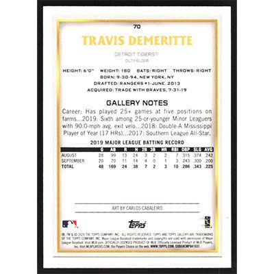 This is a 2020 Topps Gallery Travis Demeritte baseball card. The card is #70 and pictures show condition.