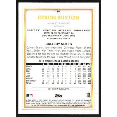 This is a 2020 Topps Gallery Byron Buxton baseball card. The card is #87 and pictures show condition.