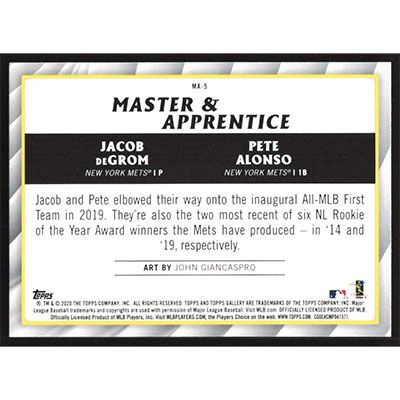 This is a 2020 Topps Gallery Master & Apprentice Jacob deGrom and Pete Alonso baseball card. The card is #MA-5 and pictures show condition. Team(s): New York Mets