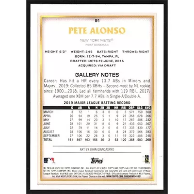 This is a 2020 Topps Gallery Rainbow Foil Pete Alonso baseball card. The card is #91 and pictures show condition.