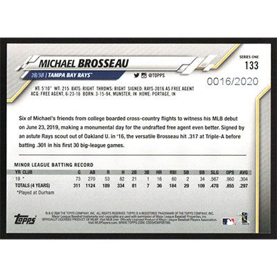 This is a 2020 Topps Gold Michael Brosseau baseball card. The card is #133 and pictures show condition. This card is limited; #'d 0016/2020. Team(s): Tampa Bay Rays Rookie Card (RC)