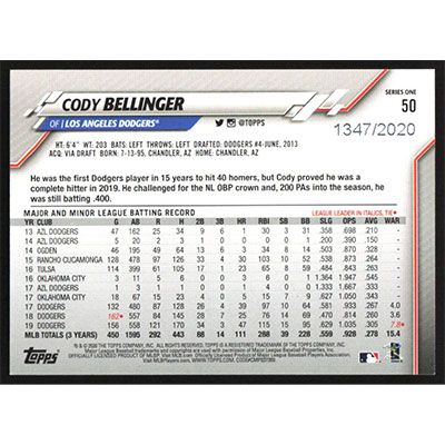 This is a 2020 Topps Gold Cody Bellinger baseball card. The card is #50 and pictures show condition. This card is limited; #'d 1347/2020. Team(s): Los Angeles Dodgers