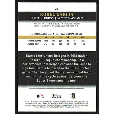 This is a 2020 Topps Gold Label Class 1 Robel Garcia baseball card. The card is #21 and pictures show condition. Team(s): Chicago Cubs Rookie Card (RC)