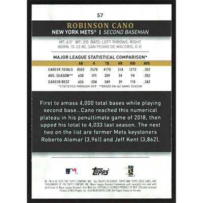This is a 2020 Topps Gold Label Class 3 Robinson Cano baseball card. The card is #57 and pictures show condition.