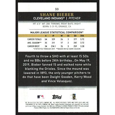 This is a 2020 Topps Gold Label Class Shane Bieber baseball card. The card is #33 and pictures show condition.