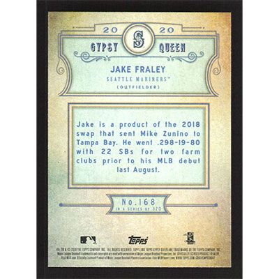 This is a 2020 Topps Gypsy Queen Jake Fraley baseball card. The card is #168 and pictures show condition.
