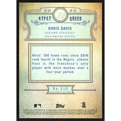 This is a 2020 Topps Gypsy Queen Khris Davis baseball card. The card is #210 and pictures show condition.