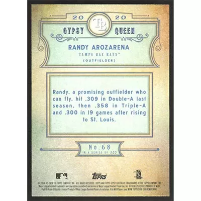 This is a 2020 Topps Gypsy Queen Randy Arozarena baseball card. The card is #68 and pictures show condition. Team(s): Tampa Bay Rays Rookie Card (RC)