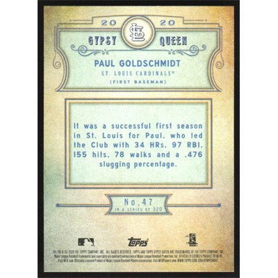 This is a 2020 Topps Gypsy Queen Silver Paul Goldschmidt baseball card. The card is #47 and pictures show condition.