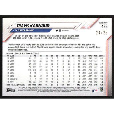 This is a 2020 Topps Memorial Day Camo Travis d'Arnaud baseball card. The card is #436 and pictures show condition. This card is limited; #'d 24/25. Team(s): Atlanta Braves
