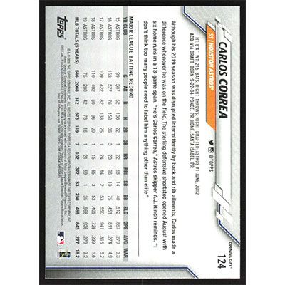This is a 2020 Topps Opening Day Carlos Correa baseball card. The card is #124 and pictures show condition.