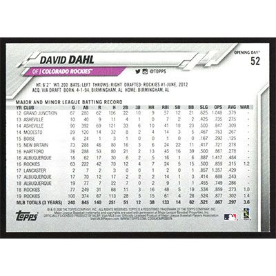 This is a 2020 Topps Opening Day David Dahl baseball card. The card is #52 and pictures show condition.