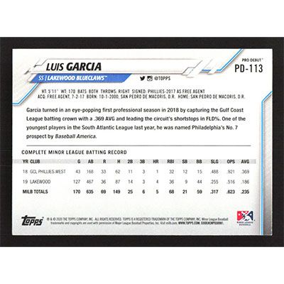 This is a 2020 Topps Pro Debut Luis Garcia baseball card. The card is #PD-113 and pictures show condition.