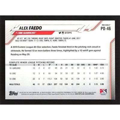 This is a 2020 Topps Pro Debut Alex Faedo baseball card. The card is #PD-46 and pictures show condition.
