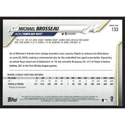 This is a 2020 Topps Rainbow Foil Michael Brosseau baseball card. The card is #133 and pictures show condition. Team(s): Tampa Bay Rays Rookie Card (RC)