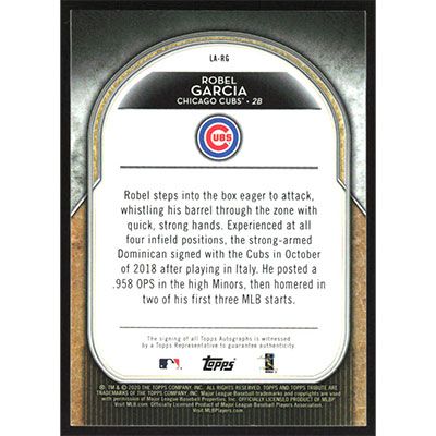 This is a 2020 Topps Tribute League Inauguration Autographs Robel Garcia autographed baseball card. This card has been signed, in blue, by Robel Garcia, and is certified authentic by Topps. The card is #LA-RG and pictures show condition. This card is limited; #'d 99/99.