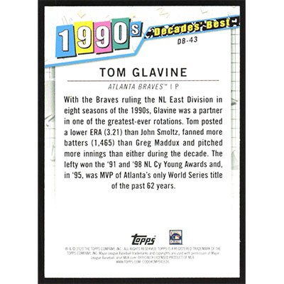This is a 2020 Topps Update Decades' Best Tom Glavine baseball card. The card is #DB-43 and pictures show condition.