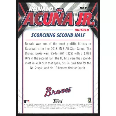 This is a 2020 Topps Update Ronald Acuña Jr. Highlights baseball card. The card is #TRA-9 and pictures show condition.