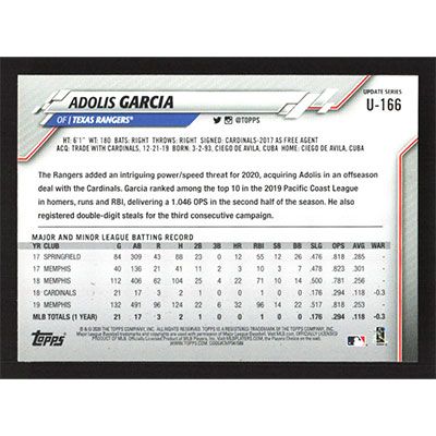 This is a 2020 Topps Update Adolis Garcia baseball card. The card is #U-166 and pictures show condition.