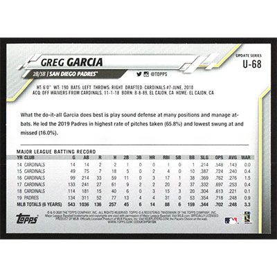 This is a 2020 Topps Update Walgreens Yellow Greg Garcia baseball card. The card is #U-68 and pictures show condition.