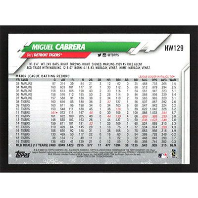 This is a 2020 Topps Wal-Mart Holiday Miguel Cabrera baseball card. The card is #HW129 and pictures show condition.