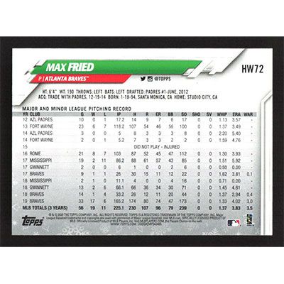 This is a 2020 Topps Wal-Mart Holiday Max Fried baseball card. The card is #HW72 and pictures show condition.