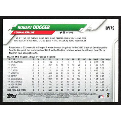 This is a 2020 Topps Wal-Mart Holiday Robert Dugger baseball card. The card is #HW79 and pictures show condition. Team(s): Miami Marlins Rookie Card (RC)