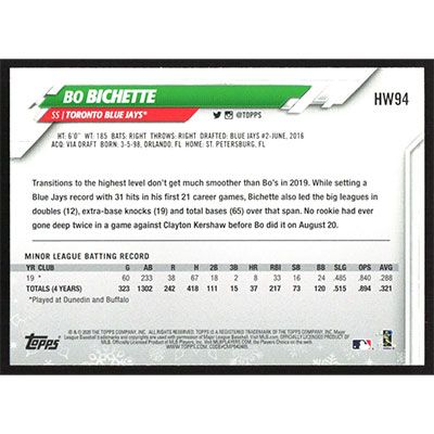 This is a 2020 Topps Wal-Mart Holiday Bo Bichette baseball card. The card is #HW94 and pictures show condition. Team(s): Toronto Blue Jays Rookie Card (RC)