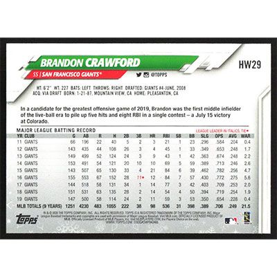 This is a 2020 Topps Wal-Mart Holiday Metallic Brandon Crawford baseball card. The card is #HW29 and pictures show condition. Team(s): San Francisco Giants