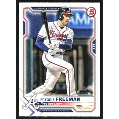 This is a 2021 Bowman Freddie Freeman baseball card. The card is #14 and pictures show condition.