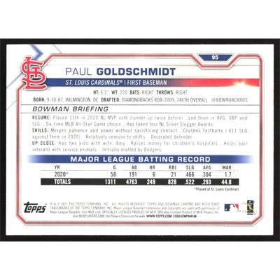This is a 2021 Bowman Paul Goldschmidt baseball card. The card is #95 and pictures show condition.