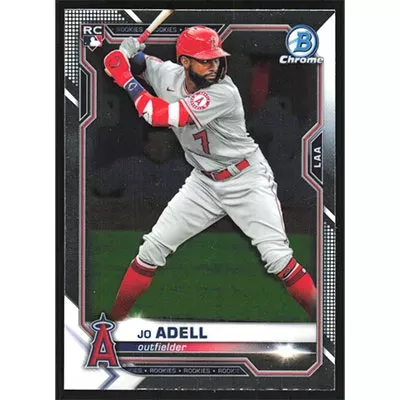 This is a 2021 Bowman Chrome Jo Adell baseball card. The card is #42 and pictures show condition.