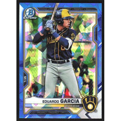 This is a 2021 Bowman Chrome Draft Sapphire Eduardo Garcia baseball card. The card is #BDC-22 and pictures show condition.