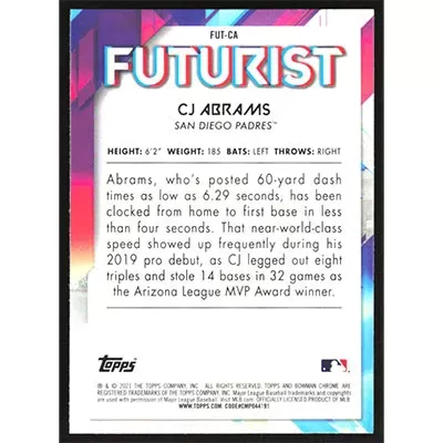 This is a 2021 Bowman Chrome Futurist Refractors CJ Abrams baseball card. The card is #FUT-CA and pictures show condition.