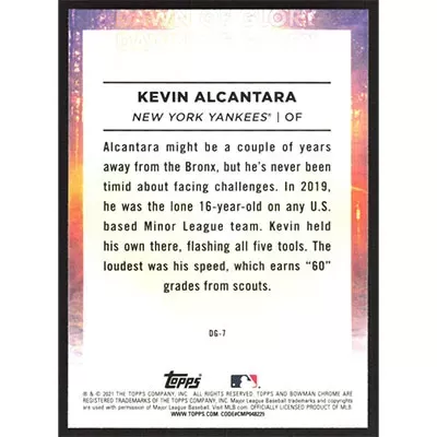 This is a 2021 Bowman Chrome Mega Box Dawn of Glory Refractors Kevin Alcantara baseball card. The card is #DG-7 and pictures show condition. Team(s): New York Yankees