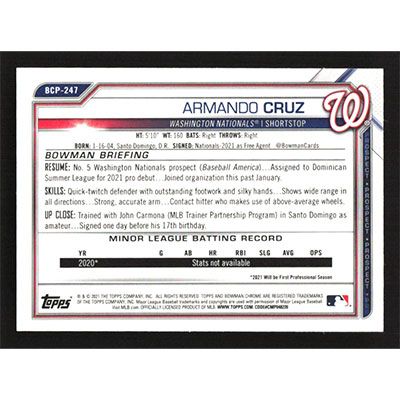 This is a 2021 Bowman Chrome Mega Box Prospects Refractors Armando Cruz baseball card. The card is #BCP-247 and pictures show condition. Team(s): Washington Nationals
