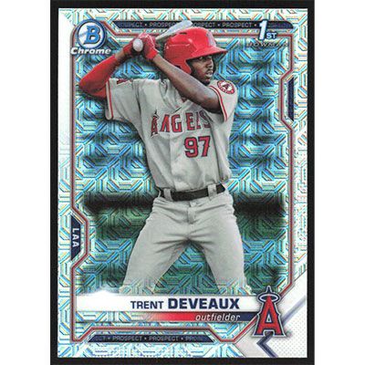 This is a 2021 Bowman Chrome Mega Box Prospects Refractors Trent Deveaux baseball card. The card is #BCP-94 and pictures show condition. Team(s): Los Angeles Angels