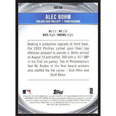 This is a 2021 Bowman Chrome Mega Box Rookie of the Year Favorites Refractors Alec Bohm baseball card. The card is #RRY-AB and pictures show condition.