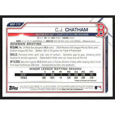 This is a 2021 Bowman Chrome Prospects C.J. Chatham baseball card. The card is #BCP-113 and pictures show condition.