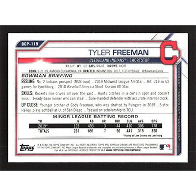 This is a 2021 Bowman Chrome Prospects Tyler Freeman baseball card. The card is #BCP-119 and pictures show condition.