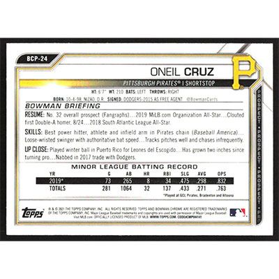 This is a 2021 Bowman Chrome Prospects Oneil Cruz baseball card. The card is #BCP-24 and pictures show condition.