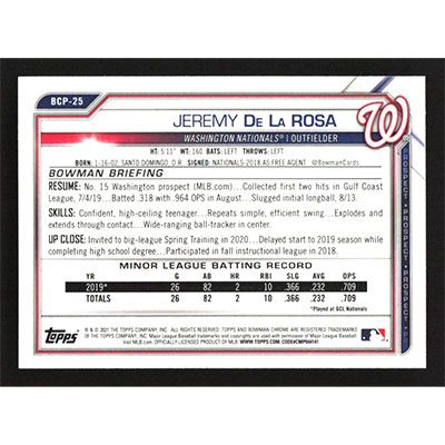This is a 2021 Bowman Chrome Prospects Jeremy De La Rosa baseball card. The card is #BCP-25 and pictures show condition.