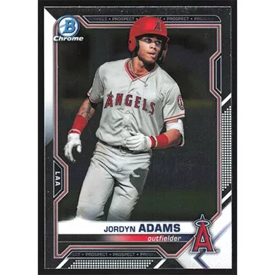 This is a 2021 Bowman Chrome Prospects Jordyn Adams baseball card. The card is #BCP-30 and pictures show condition.