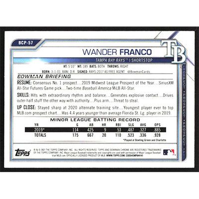 This is a 2021 Bowman Chrome Prospects Wander Franco baseball card. The card is #BCP-57 and pictures show condition.