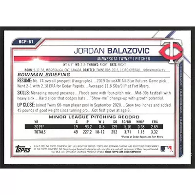 This is a 2021 Bowman Chrome Prospects Jordan Balazovic baseball card. The card is #BCP-61 and pictures show condition.