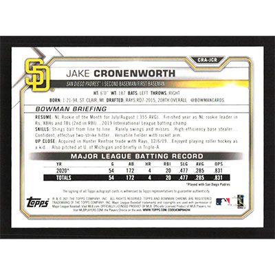 This is a 2021 Bowman Chrome Rookie Autographs Jake Cronenworth autographed baseball card. This card has been signed, in blue, by Jake Cronenworth, and is certified authentic by Topps. The card is #CRA-JCR and pictures show condition.